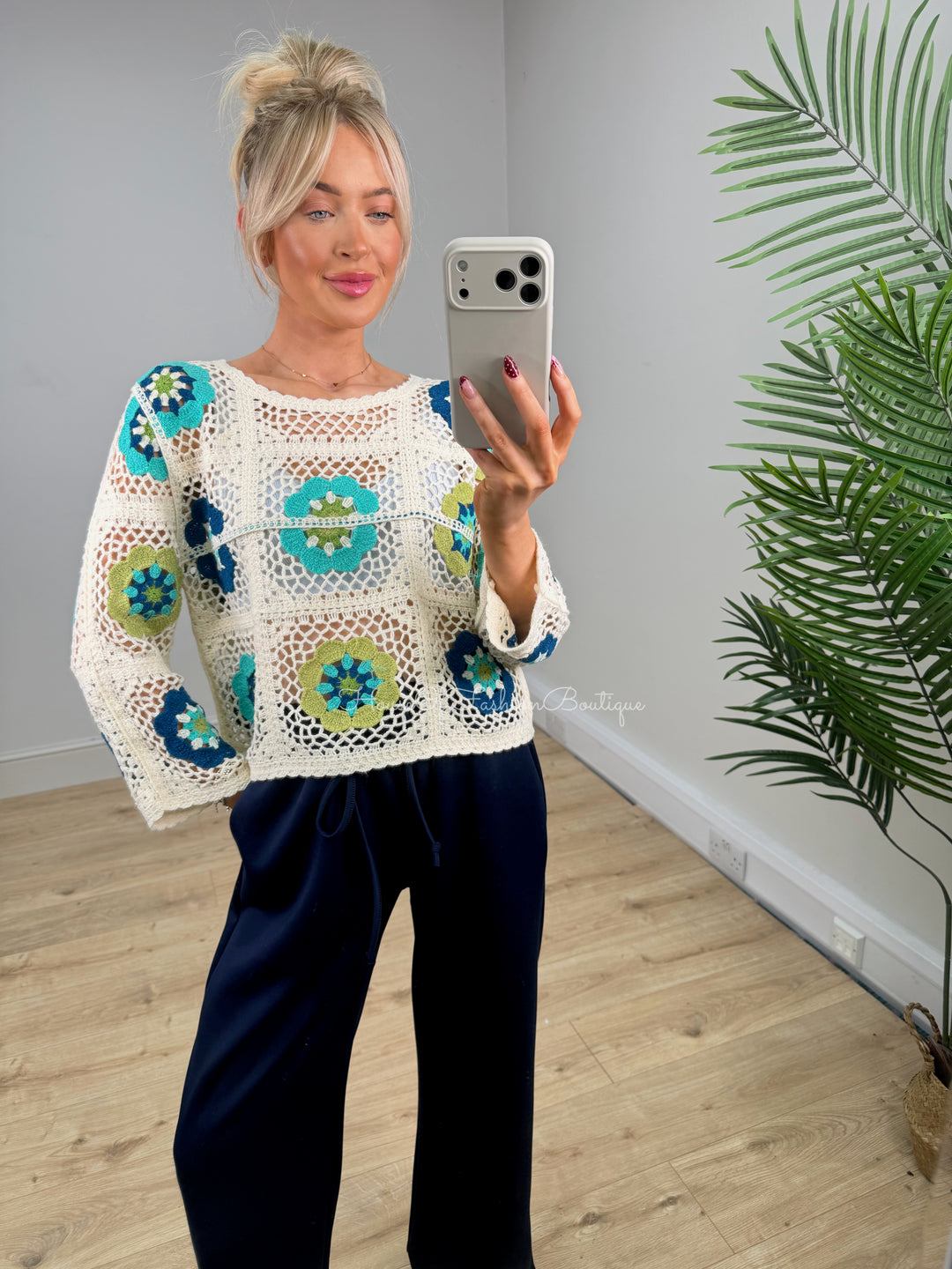 Mia Crochet Flower - Green & Navy